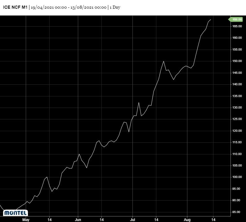 Our most recent Montel Weekly podcast also detailed how the more stringent carbon scheme in Europe is now the main driver for soaring carbon prices - and despite that the movement in coal is astonishing. Taking a rough global average from last year, prices fell to somewhere near $50 per tonne, but if you now look at the Newcastle contract for delivery in Sep-2021 (below) it’s more than tripled in value since then to just under $170 per tonne.